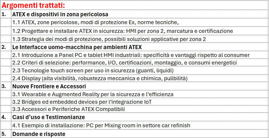 L’interfaccia uomo-macchina (HMI) è il fulcro operativo nei processi industriali in ambiente ATEX, consentendo il controllo, il monitoraggio e la manutenzione in sicurezza. In un contesto in cui la connettività e l’intelligenza artificiale rivoluzionano l’industria, scegliere la HMI giusta è cruciale per aumentare efficienza, sicurezza ed ergonomia. In questo webinar, affronteremo criteri di selezione, requisiti normativi e funzionali e le tecnologie HMI più avanzate per le aree pericolose.